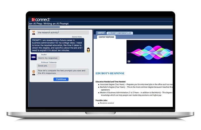 Instructors can now assign AI literacy learning modules within the Connect digital course solution to help students learn how to apply GenAI thoughtfully and effectively. The modules focus on practical use cases and real-world applications covering topics such as prompt refinement, searching for jobs in the age of AI, and using AI ethically and responsibly.