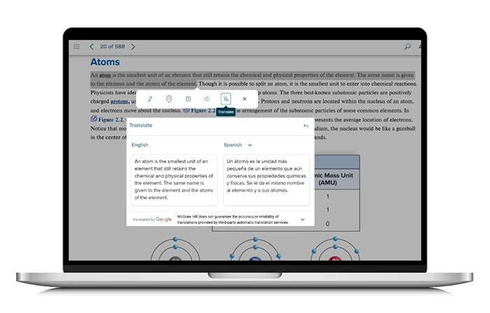 A new Translation Tool, available for most Connect eBook titles this spring, allows students to select text and view both the original and translated content side-by-side. With support for 38 languages at launch, this feature enables multilingual learners to better navigate course materials while ensuring their reading remains aligned with instructor assignments.