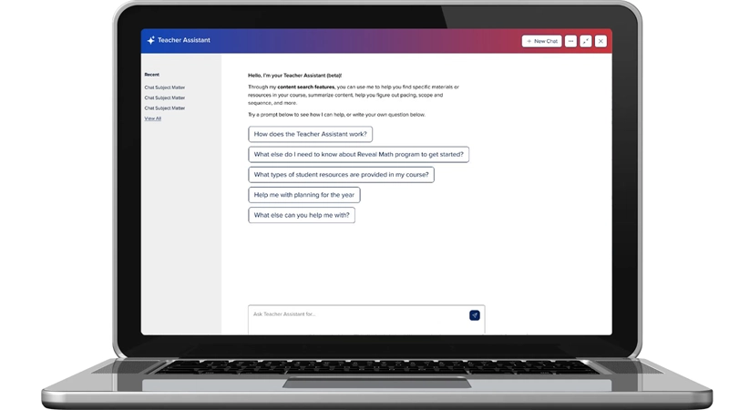 Teacher Assistant, available in California Reveal Math, is an AI-powered chatbot that gives teachers instant planning and support through natural language conversations. It helps educators understand available resources, gain insight into course design, and quickly find the most relevant materials to differentiate instruction, empowering them to personalize learning and save valuable classroom time.