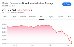Fears over the spread of coronavirus have upended daily life for millions of Americans and countless businesses. The CDC has recommended that organizations cancel any events with 50 or more people, and restaurants around the country are either switching to take-out only or closing entirely. As a result of the uncertainty surrounding this health crisis, financial markets around the globe are experiencing near-record drops in value. In fact, on Monday the Dow Jones Industrial Average plummeted by about 3,000 points, representing a bigger single-day percentage decline than the crash that preceded the Great Depression in 1929.