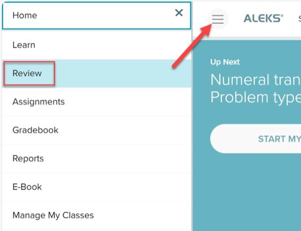 Review Mode for ALEKS adaptive assignments is available automatically, and there’s nothing you need to do to set it up for your course. Students can review topics they have previously learned or mastered by opening their ALEKS menu and clicking on Review.