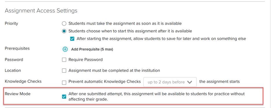 When setting up non-adaptive homework assignments, quizzes, and tests, you’ll see the Review Mode option in the assignment settings: