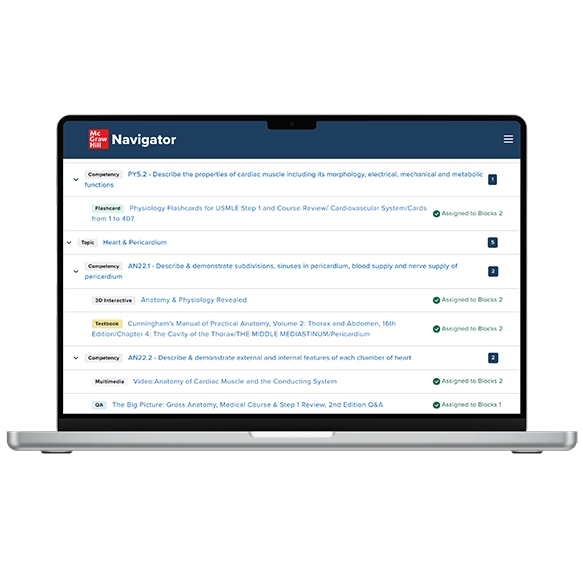 Navigator by McGraw Hill is a competency-based medical education (CBME) platform that combines trusted Access® content with curriculum mapping tools to help institutions deliver outcomes-driven medical education with confidence.