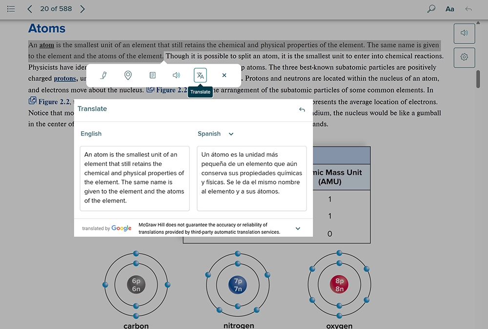 Our new Translation Tool, available for most Connect eBook titles, allows students to select text and view both the original and translated content side-by-side. With support for 38 languages at launch, this feature is especially beneficial for multilingual learners, enabling them to better navigate course materials while ensuring their reading remains aligned with instructor assignments.