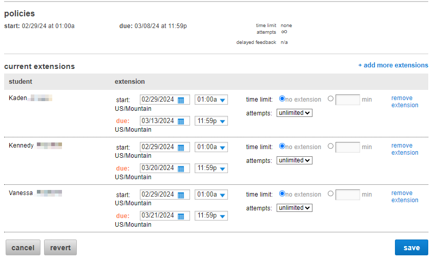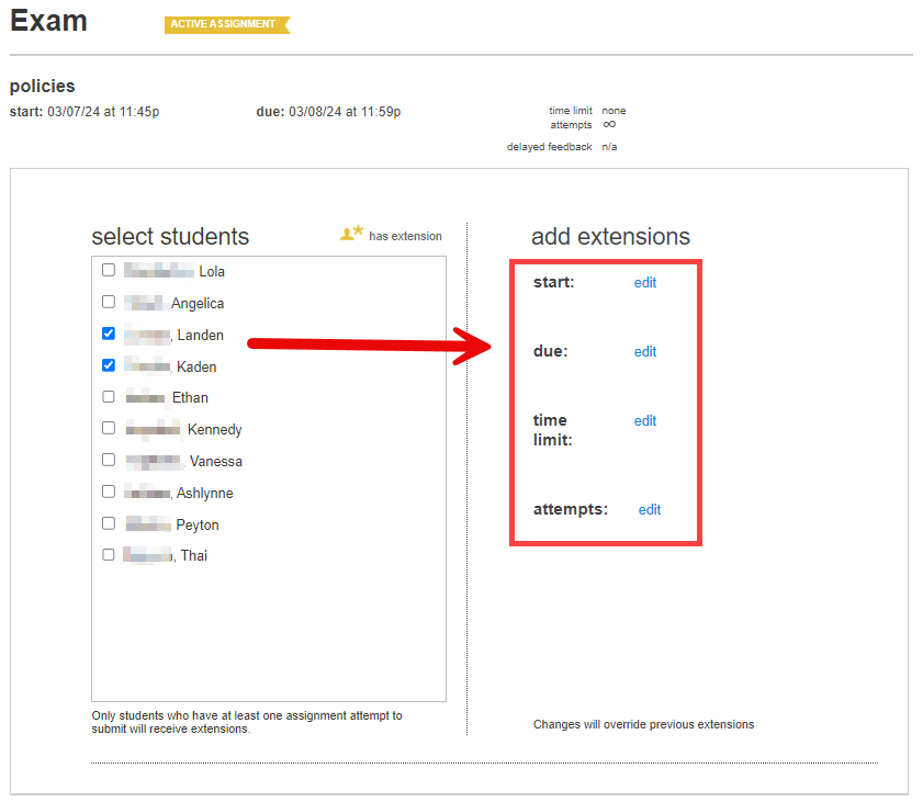 - Extend assignment due dates, time limits, and/or number of attempts for students with excused extensions or other special circumstances.