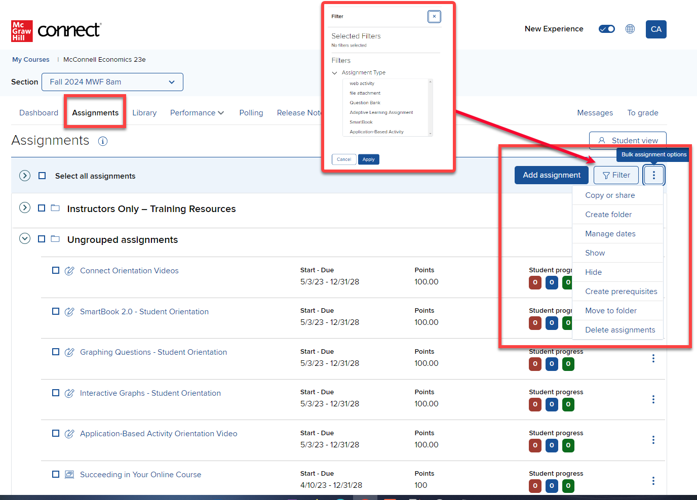 Manage the assignment list in Connect, including reordering, hiding, or organizing assignments.