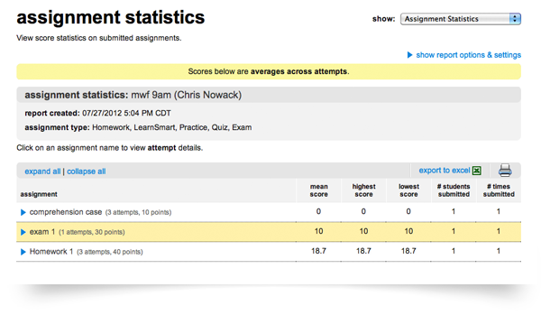 You can select individual assignments to get statistics, or just select everything in one or more of your sections. And if you want to know more about an individual assignment attempt, we have all of the same statistics for those too, so you can see if the class is improving.