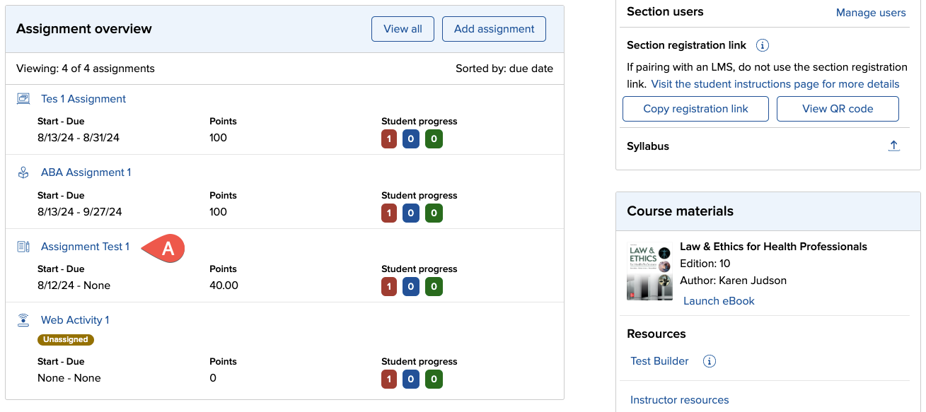 From your Section Home page, click on the assignment (A) to which you want to attach documents. You can also attach documents while creating assignments.