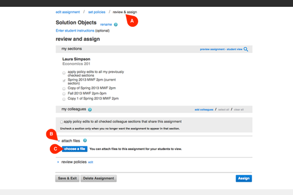 Click review & assign (A) to get to the attach files section. If you want to attach documents while creating assignments, this is the step in the creating assignments process to do so.