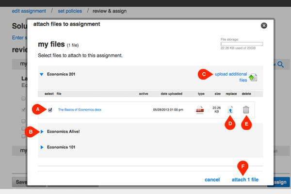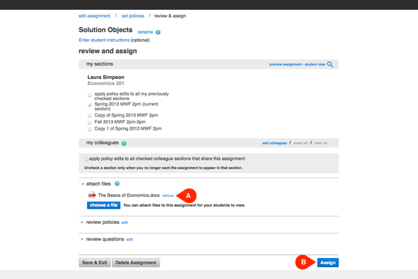 The attached files will be listed under attach files (A). Click remove (A) to delete the file. Click assign (B) to assign and make the attached files visible to students. Students will be notified when they begin an assignment that files are attached.