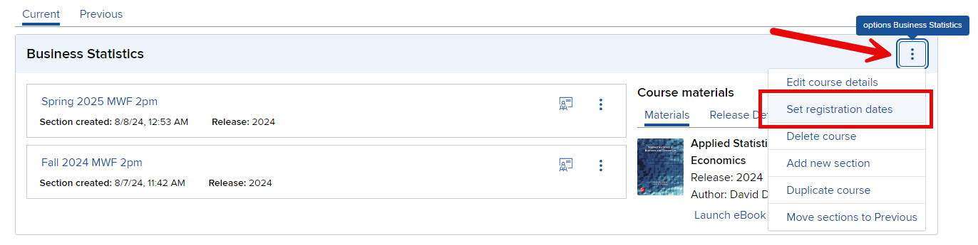 To change registrations dates from the My Courses page, click the course options menu and select Set registration dates (B).