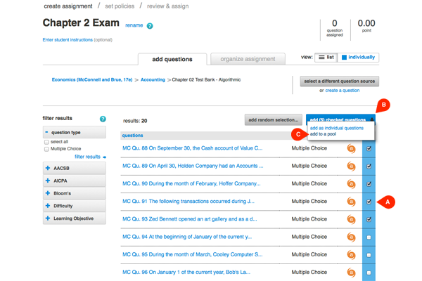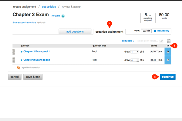 Click the organize assignment (A) tab and select the question pools (B) from which your assignment will draw. Click continue (C) to move on to the review & assignment page.