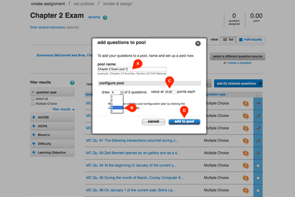 When the pop up appears, name your pool something specific (A), for example, Chapter 2 Exam pool 1. Next, configure your pool by selecting the number of questions (B) from which the pool can draw. You can also set the value of each question (C) in your pool. To save your question pool, click add to pool (D).
