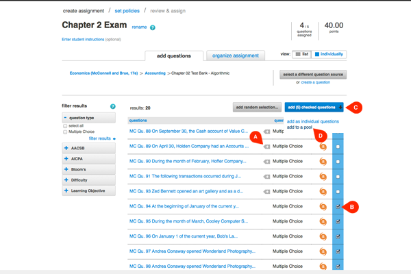 Connect will notify you that you’ve successfully added questions to a pool and bring you back to the add questions page. Now you want to create another pool to draw questions from. The questions that you’ve already selected will have a black flag (A) next to them. Select the next set of questions (B), click add checked questions (C) and select add to a pool (D) again.