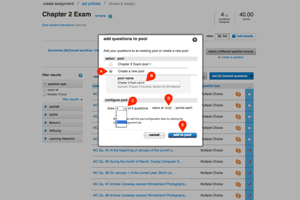 The add questions to pool module will pop up again. Select create a new pool (A) and name your second pool (B) slightly differently, for example, Chapter 2 Exam pool 2. Select the number of questions to draw (C) and set the point value (D). To save your second question pool, click add to pool (E) just as before.