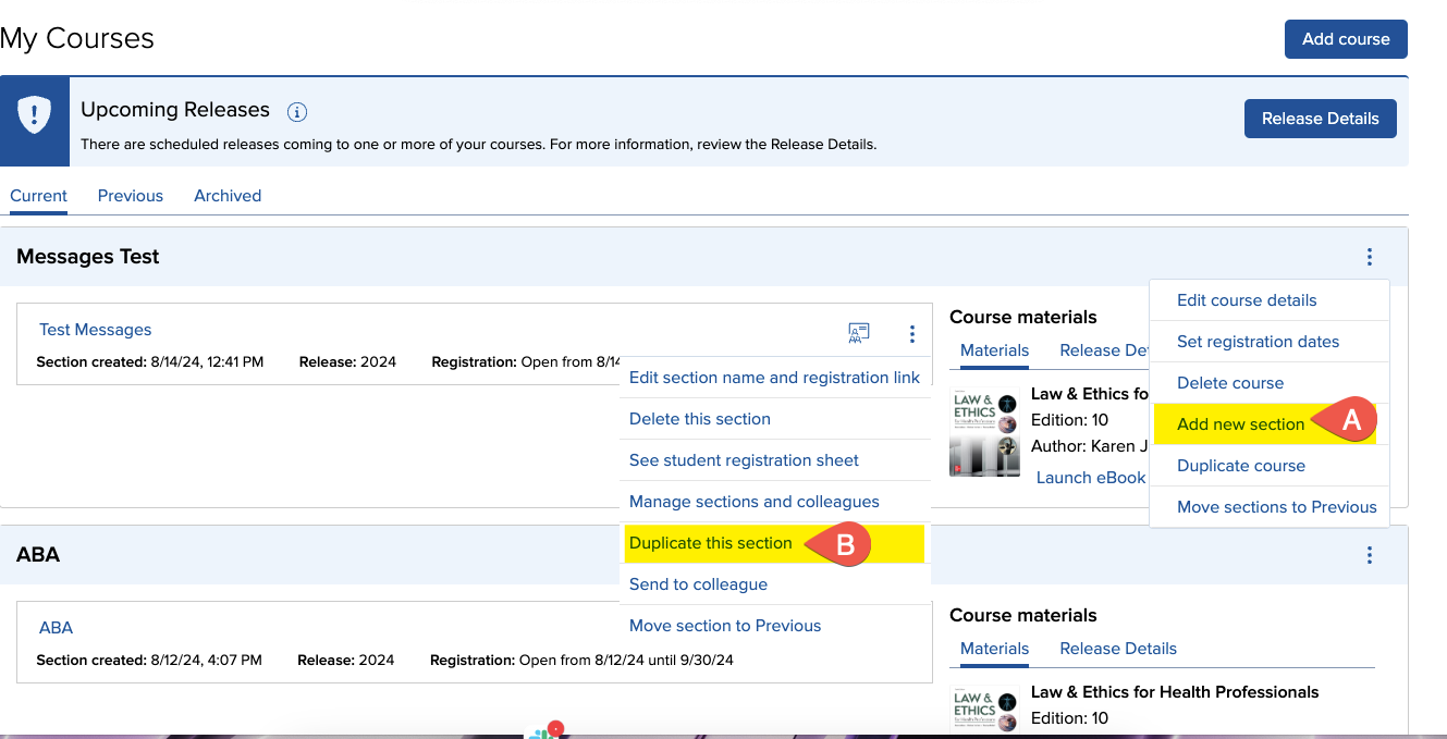 You have two options to create multiple sections from your courses page: from the course options menu, select + Add section (A) and from the section options menu, select Duplicate section (B).