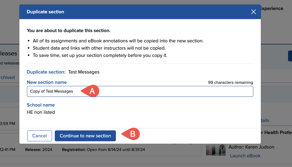 Name the new section (A) and click Continue to new section (B).