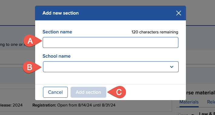 When you add a section, a modal will appear and ask you to name the new section (A). Select the School name (B) Click Add section (C) to add the section.and proceed.