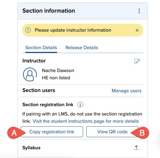 After you've added a section or created a duplicate, the Section Dashboard will appear. Section registration link area. It will contain copy registration link button (A) and View QR code button (B). you can use these buttons to provide to students the link so that they can register for your course.