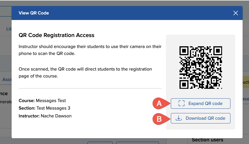 If you click view QR code, a modal pops up with the option to Expand QR code (A) or Download QR code (B)