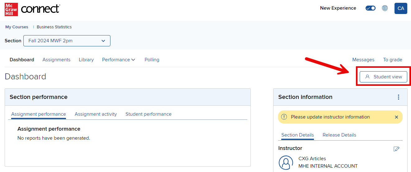 Connect includes a built-in Student View option. At any time, you can switch your view from instructor to student by clicking on the Student view button in the upper-right section of the home tab. This view will allow you to check assignment availability and preview your assignments as a student.