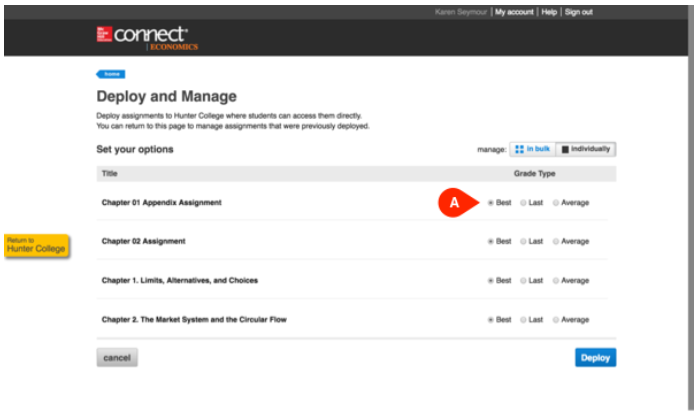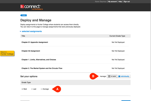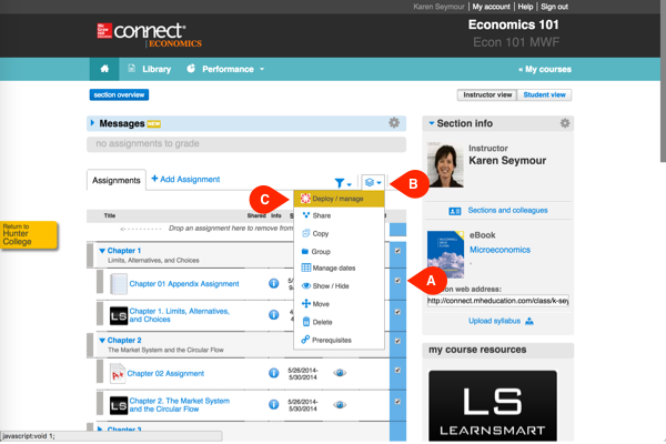 Once you're in your Connect section home, select the assignments you want to deploy by checking the checkbox in the right column (A). Then click the icon that resembles a stack of papers (B) and select Deploy / manage (C).