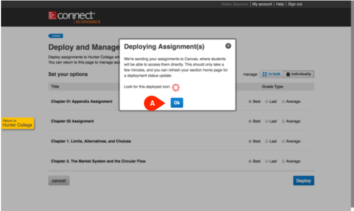 You'll receive a confirmation that your assignments are being deployed. Click Ok (A) to continue.