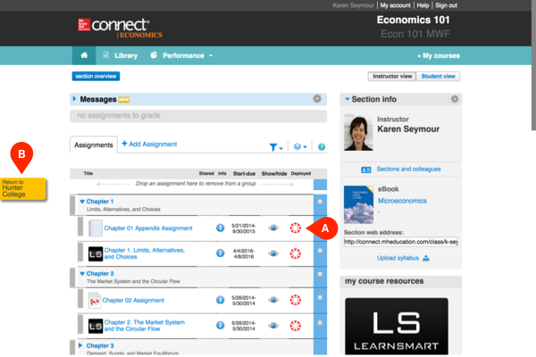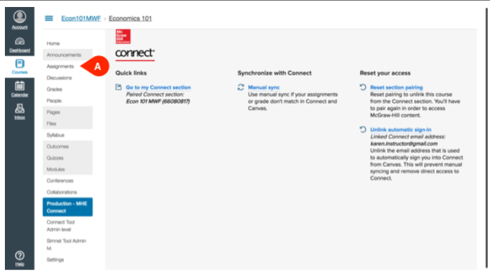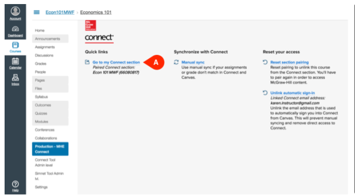 Begin by logging into Canvas and going to the McGraw-Hill page. Then click Go to my Connect section (A).
