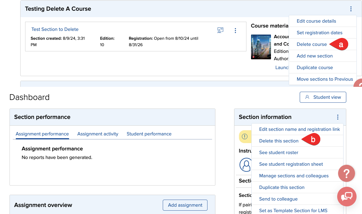 - On the Course Dashboard page select Delete section from the section options menu (B).