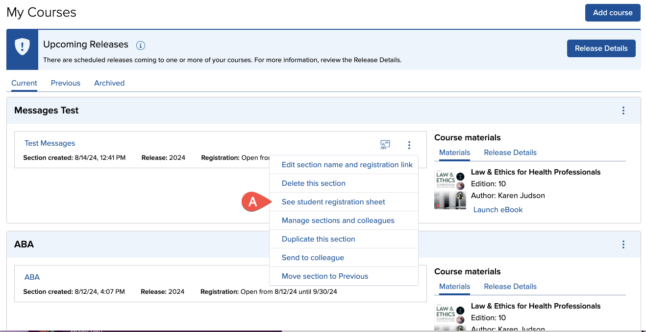 In your my courses page, in the section whose registration information you want to access, click the registration info icon (A).