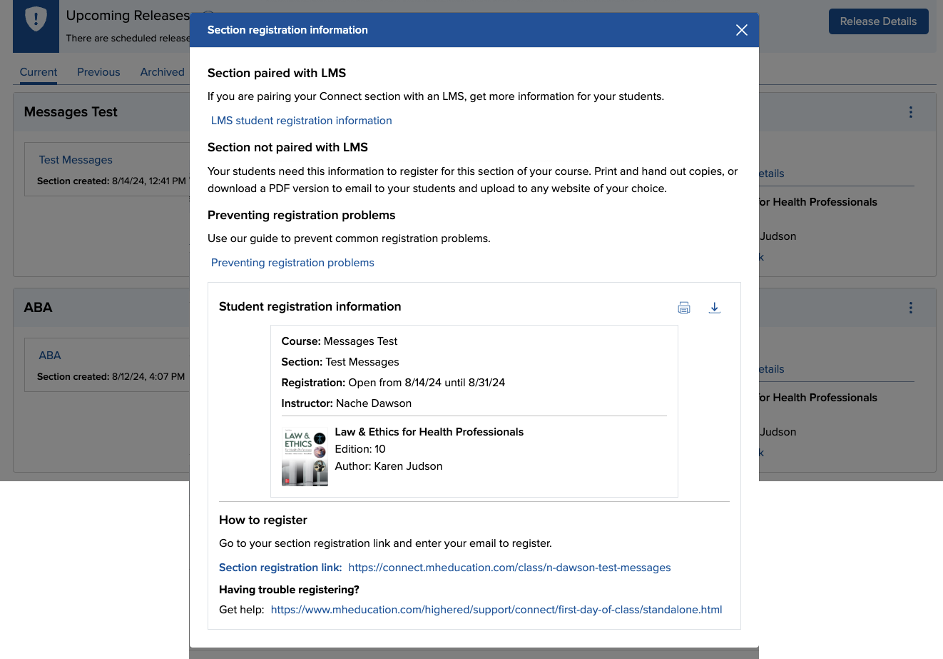 Customized student registration instructions will open with the section's specific web address (A). You may want to print a handout for your students or copy and paste your section-specific web address into your syllabus or learning management system for your students to access. Remember: You will have one unique web address for each section of your course created in Connect. Repeat the above process for each section.