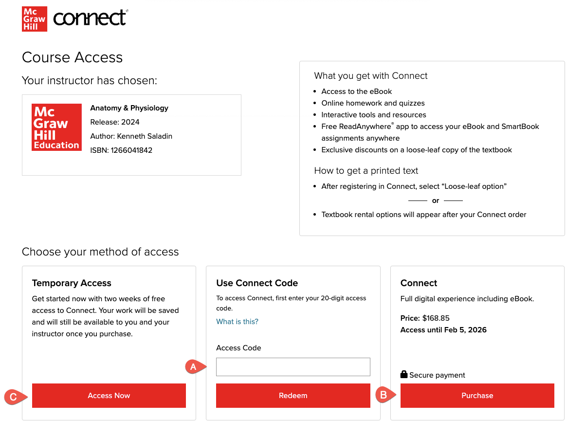 Next, students will enter the access code (A) included with their textbook package (if applicable), purchase access directly online (B), or start courtesy access (C).