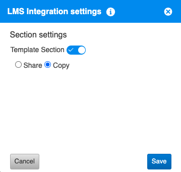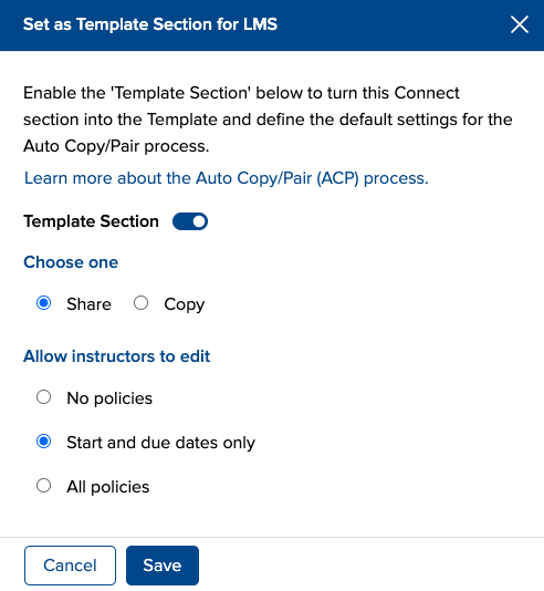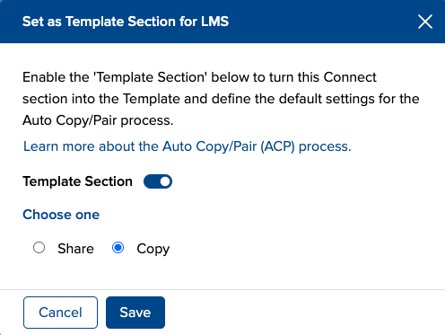 Copying or Sharing and pairing of a Connect section from the designated Template Connect section to a Learning Management System (LMS) course