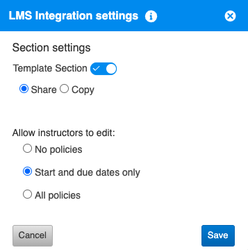 Instructors using Child sections (Shared from the Template) will have limited ability to change or manipulate the course content, assignment dates, and policies. The level of permission is determined and managed at the primary (Template) section level.