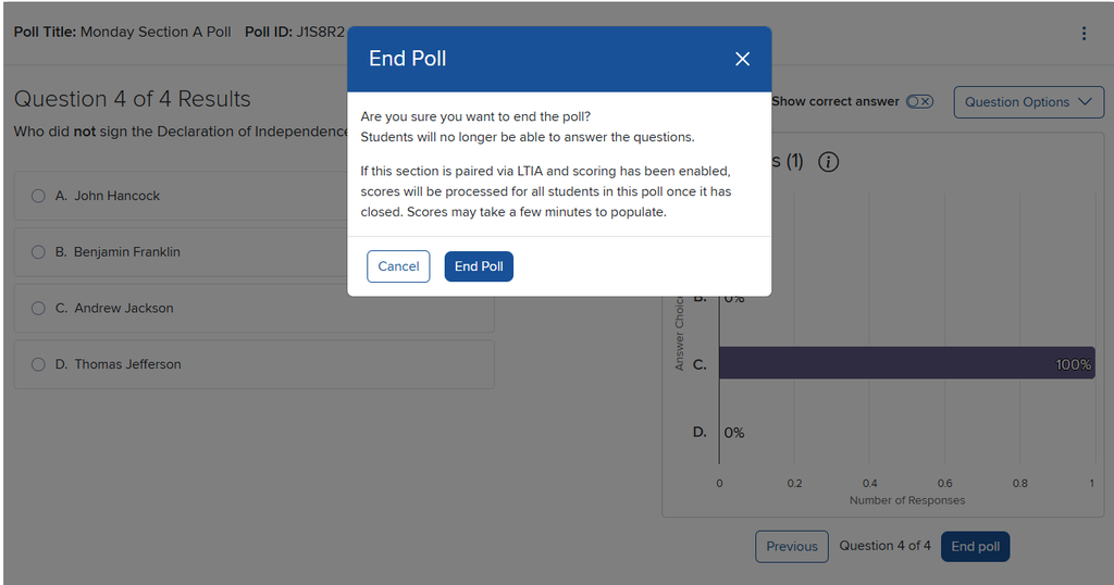 - NOTE: Scores are calculated only for questions with responses in ended polls. Example: the created poll has 6 questions but you were only able to get through 5 of the questions in class, students are not penalized for the final question that was never displayed to them in class and scores will be calculated from the 5 questions that were made available to them.