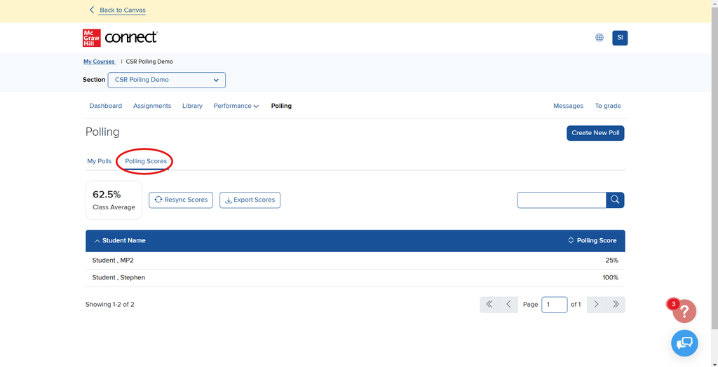 - If you attempt to launch the Polling Scores assignment from the LMS, you will be taken to the Polling Scores tab within the Polling feature