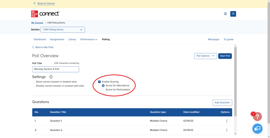 NOTE: Scoring for Polls in Connect only sync to the LMS Gradebook if the Connect Section is paired using the LTIA standard.