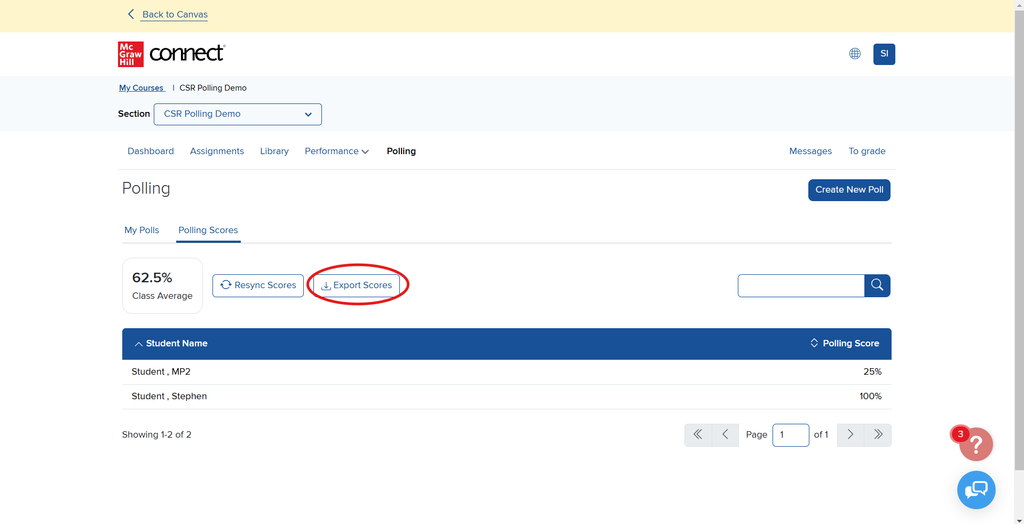 - For LMS users not using the LTIA (LTI 1.3) standard: There will be a button in the Polling Scores tab labeled “Export Scores”, selecting this button will trigger the download of a .csv file with the overall average and the score for each scored poll for every student in your Connect roster.