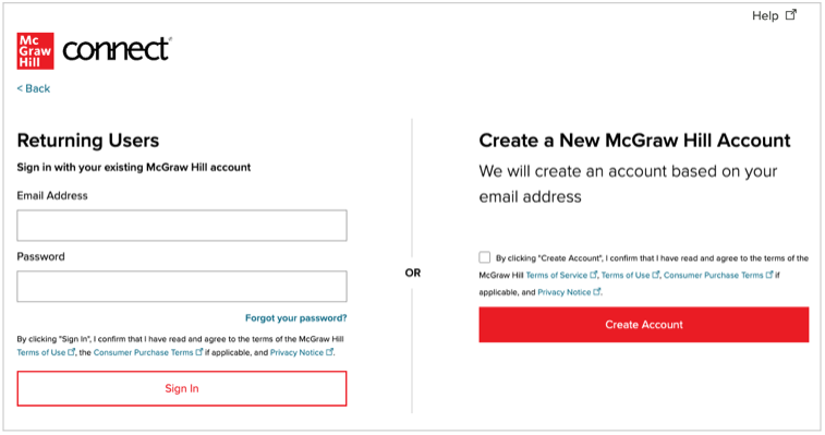 Before you can register for Connect through your school's website, your instructor must first pair the course. Depending on your school's preference, a shortcut link to Connect may be available in your course or you may need to find and launch a deployed Connect assignment. If it's your first time launching Connect from your school's website, you will be prompted to login (if you're a returning Connect student) or create a new account.