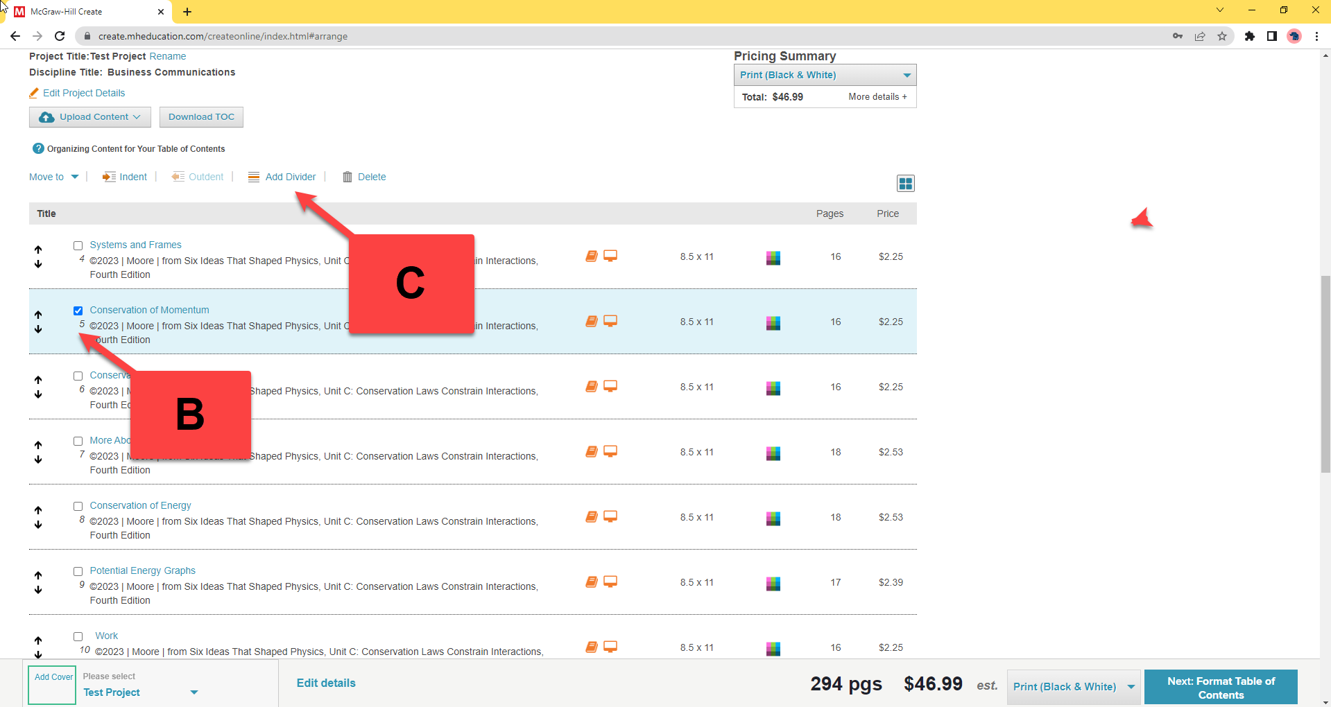 Step 2: Click the check box in the content row you want to add a divider before (B). That is, check the first content row you want to come after the divider.