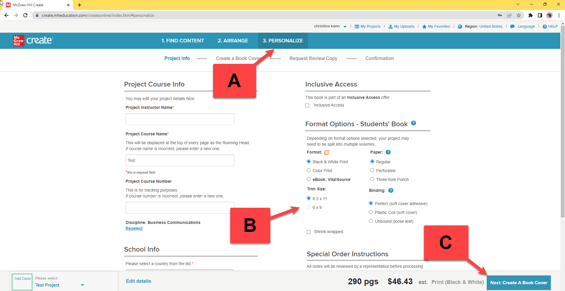 Step 1: Click the Personalize tab in the Create Menu (A). Select your format preferences (B) and then click Next: Create a Book Cover (C).