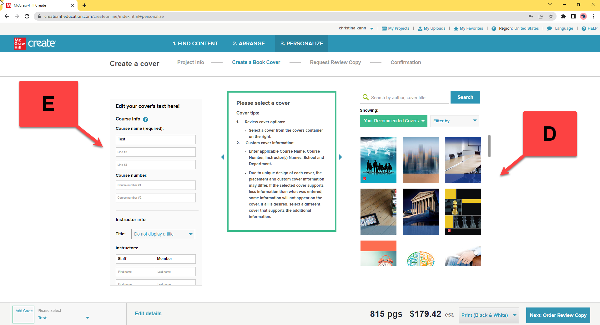 Step 3: Enter custom cover information for your course name, course number, instructor name, school, and department (E). As you enter this information, the cover preview will update with your custom text.