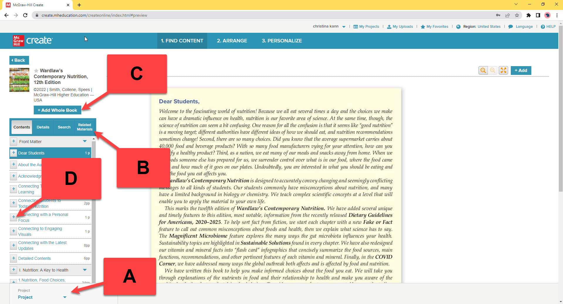 Step 3: Click Add Whole Book (C) to add the entire title to your Project. If you wish to only add specific chapters or sections, click the plus button to the left of the title of the chapter or section you wish to add in the left menu (D). Alternatively, open a chapter or section by clicking on its title in the left menu, and then click Add in the top right corner.