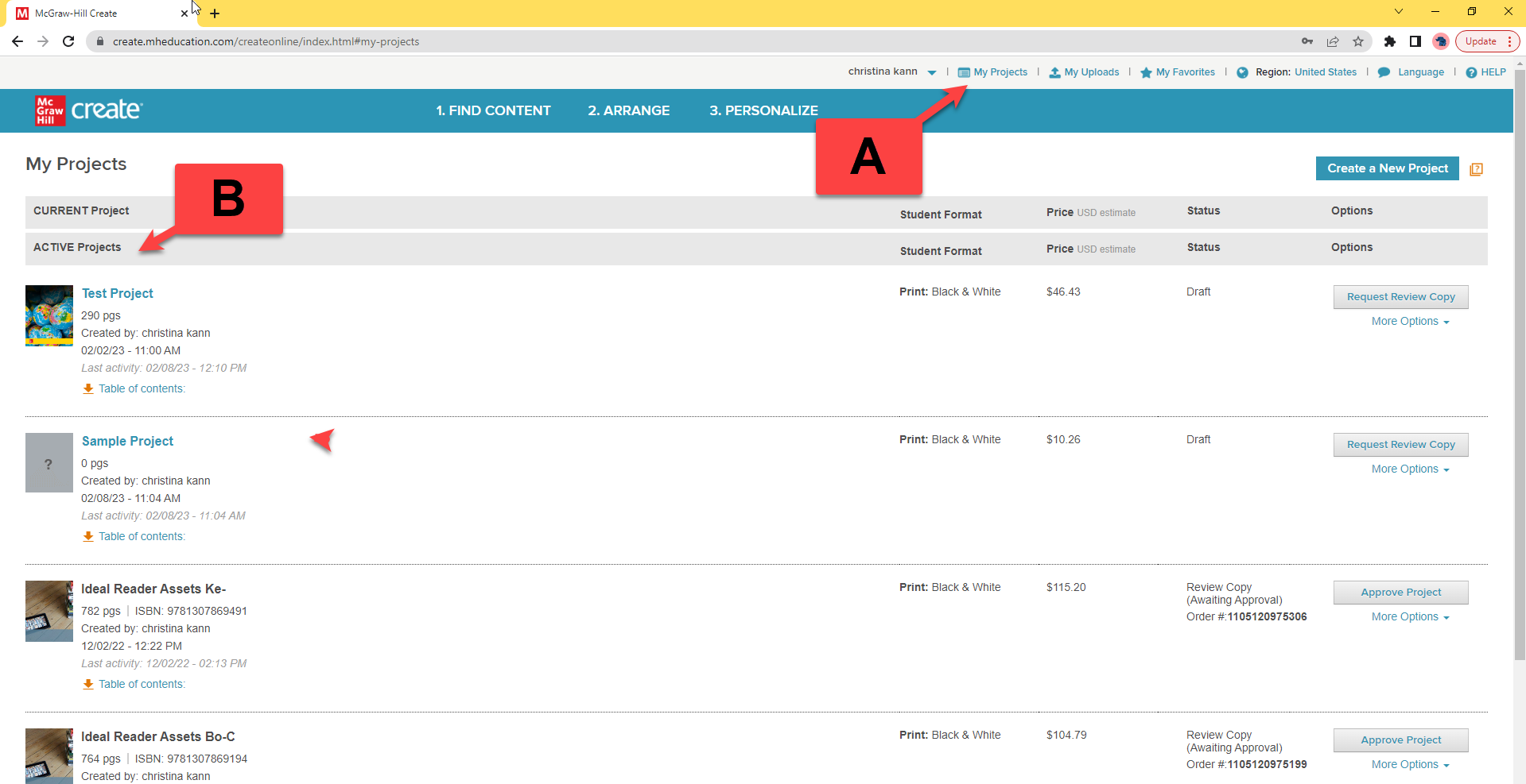 Step 2: If you already have a Project selected, it will be under the Active Projects header (B). Click on the title of the Project you’d like to work on. You will be taken to the Arrange view for the selected Project.
