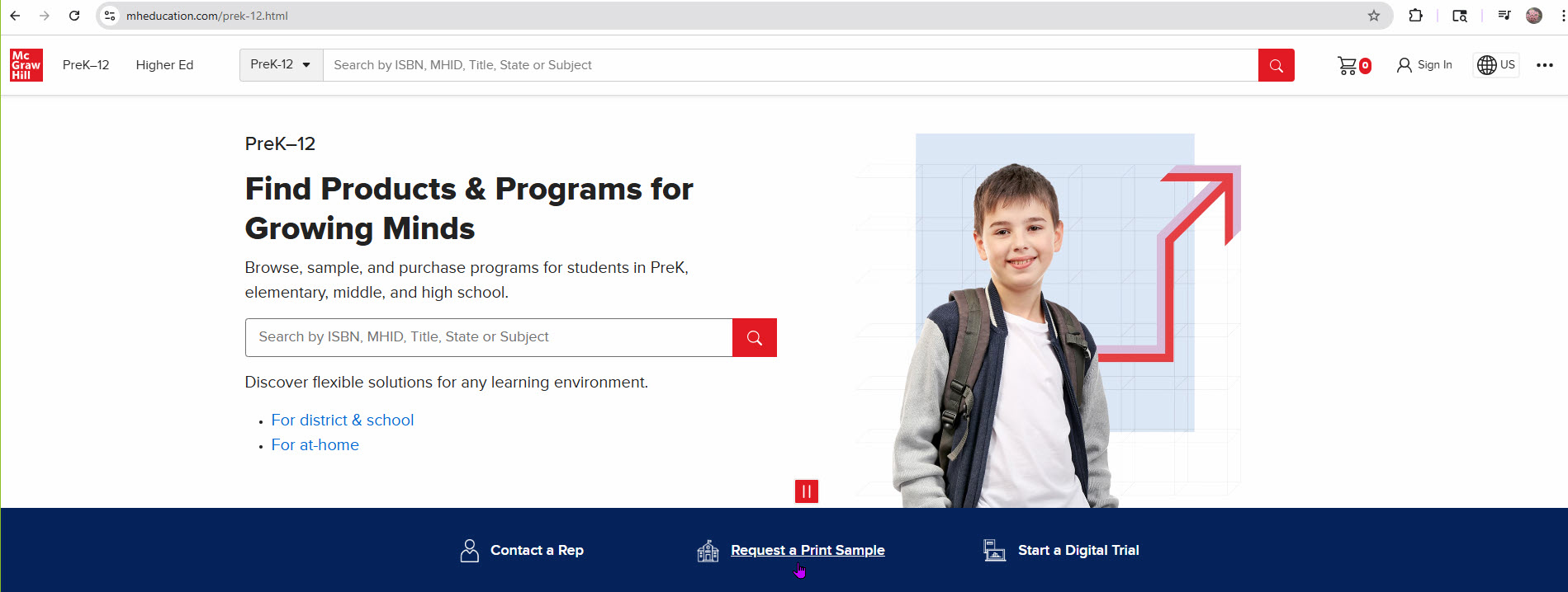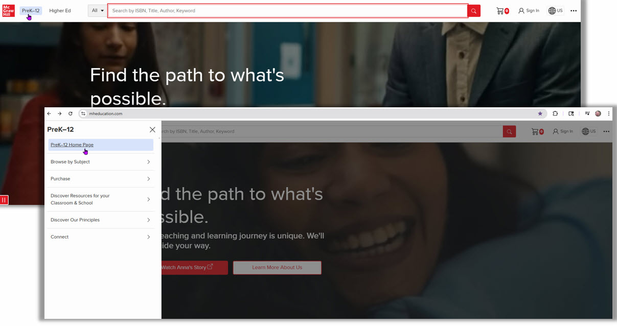 Click PreK-12 at the top left-hand side of the page and select PreK-12 Home Page.