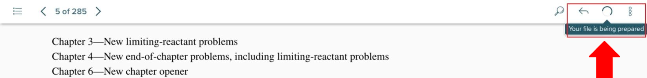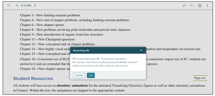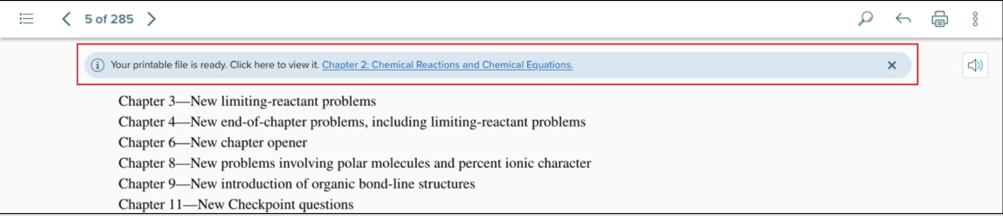 Once the PDF file is ready, a notification at the top of the MH eBook will say the “printable file is ready.” Click on the link within the message to view and/or print the PDF file. If you dismiss the notification, you will need to go through the process of regenerating the PDF file again.
