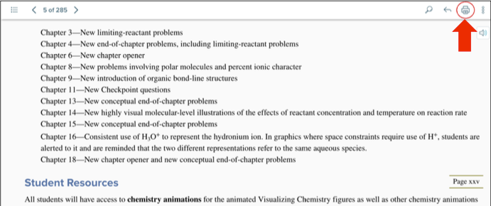 Step 1: Within the MH eBook, select the print button at the top right-hand corner of the screen