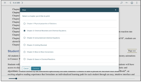 Step 2: From the “Print” dialog box, select the chapter you wish to print. Click Continue.