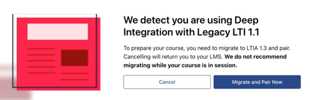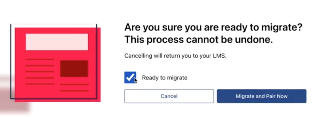 - If your course is ready for migration, you will see this window. Click Cancel to exit or Migrate and Pair Now.