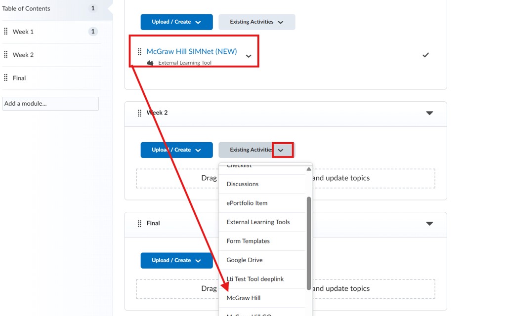 - Within your D2L course, navigate to the content area. (You will already have the “McGraw Hill SIMnet LTI 1.1” Tool.)